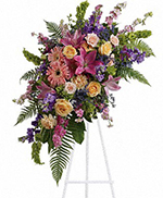 Our Thoughtful Prayers Standing Spray beautifully remembers their passion and radiance within each bright bloom. Bold lilies, roses, stock and snapdragons are paired with lush greens to celebrate the life of a loved one. [...]